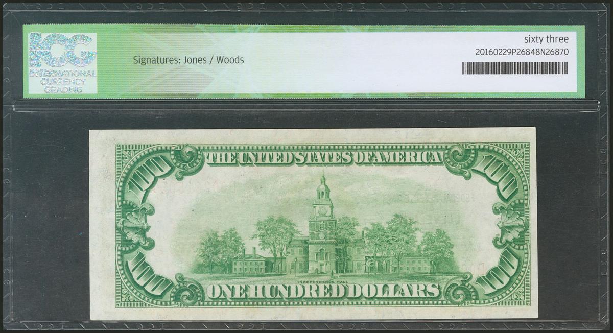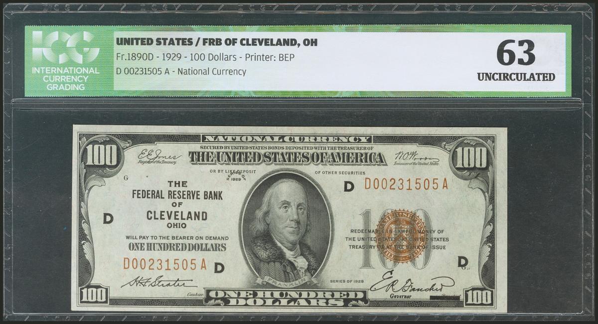 USA. 100 Dollars. National Currency. Cleveland. Serial number D-A. 1929. (Friedberg: 1890D, Pick: 399D). ICG63.