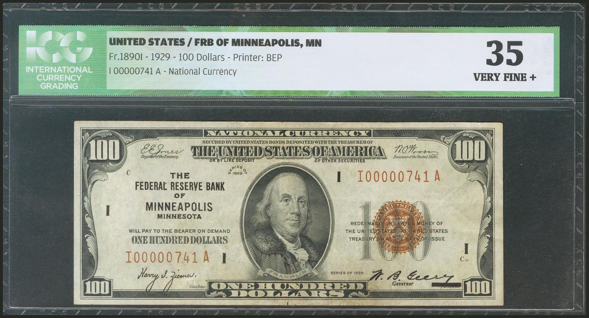 USA. 100 Dollars. National Currency. Minneapolis. Serial number I-A. 1929. (Friedberg: 1890I, Pick: 399I). ICG35.