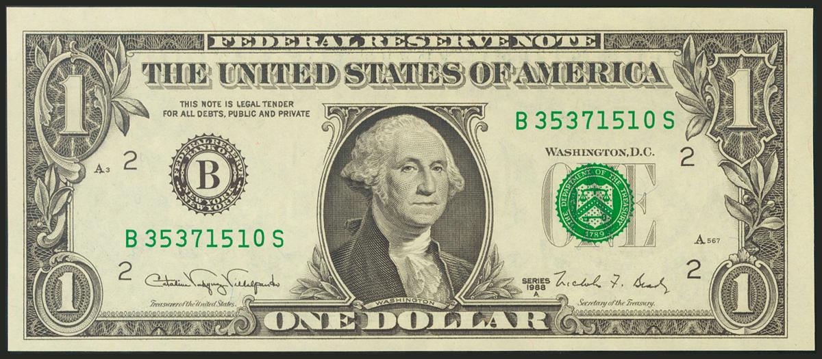 USA. 1 Dollar. Federal Reserve Note. New York. Serial number B-S. 1988A. (Friedberg: 1915B). Uncirculated.