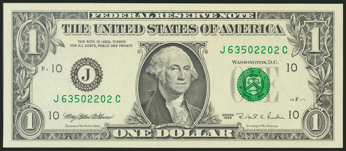 USA. 1 Dollar. Federal Reserve Note. Kansas City. Serial number J-C. 1995. (Friedberg: 1922J, Pick: 496). Uncirculated.