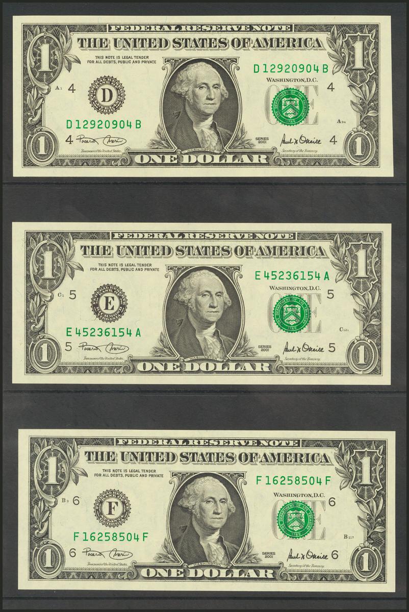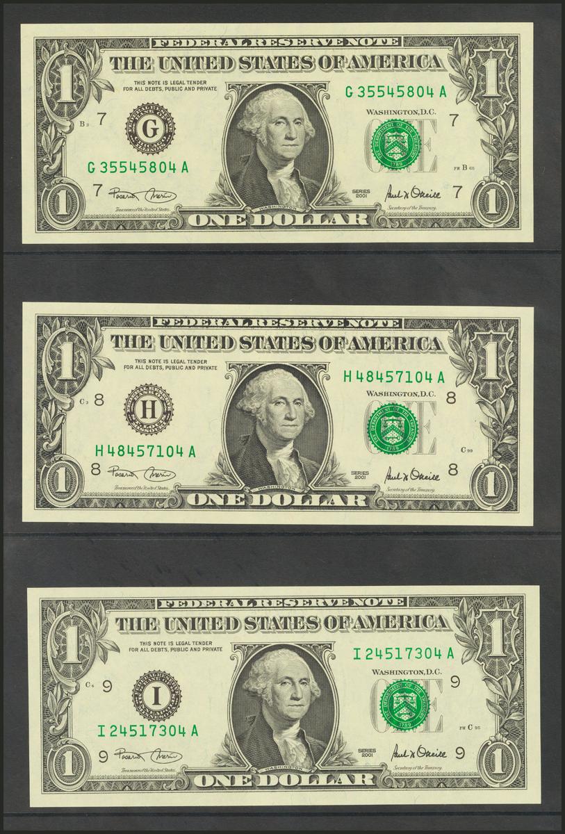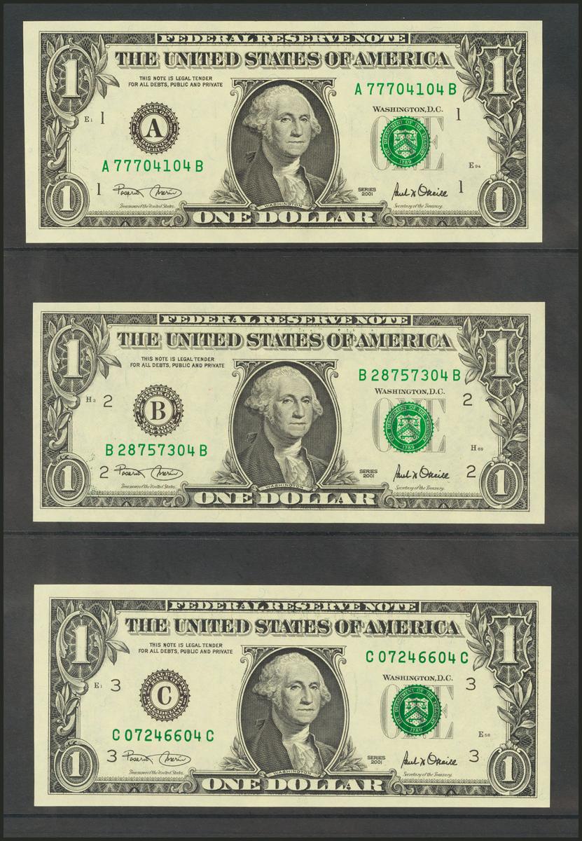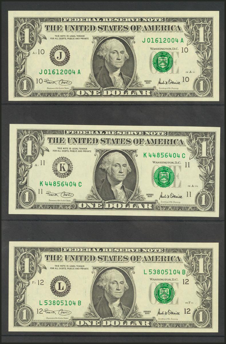 USA. 1 Dollar. Federal Reserve Note. 12 banknotes from serial number A to L (all issuing banks incuded). 2001. (Friedberg: 1926-27A/L). Nice set. Uncirculated.
