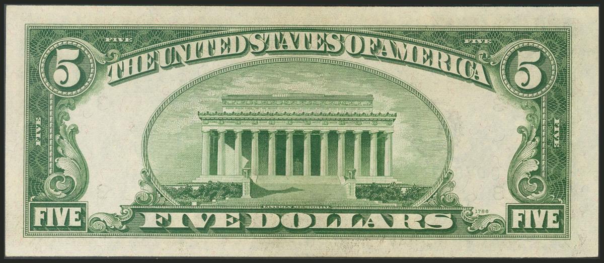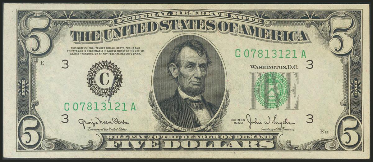 USA. 5 Dollars. Federal Reserve Note. Philadelphia. Serial number C-A. 1950D. (Friedberg: 1961C, Pick: 438D). Extremely fine.