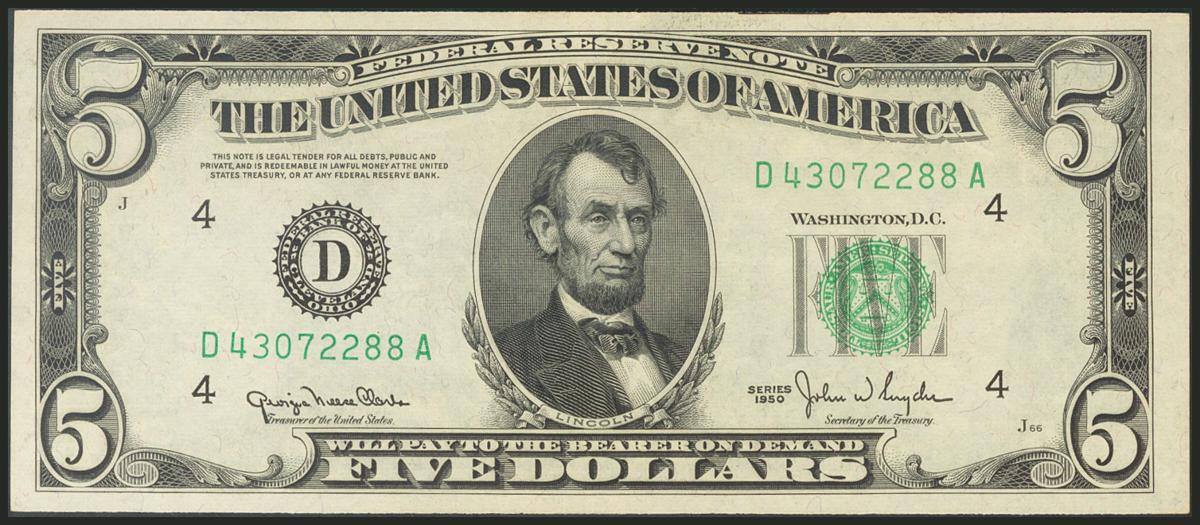 USA. 5 Dollars. Federal Reserve Note. Cleveland. Serial number D-A. 1950. (Friedberg: 1961D, Pick: 438). Extremely fine.