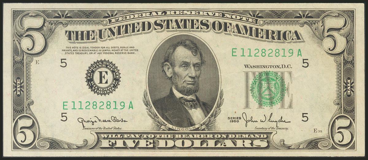 USA. 5 Dollars. Federal Reserve Note. Richmond. Serial number E-A. 1950. (Friedberg: 1961E, Pick: 438). Very fine.