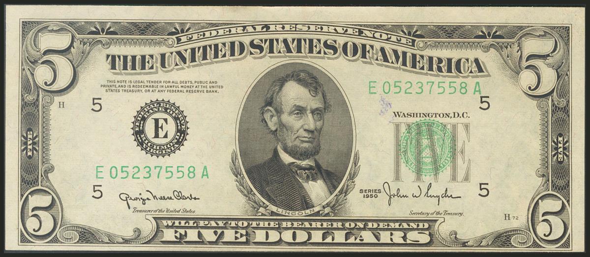 USA. 5 Dollars. Federal Reserve Note. Richmond. Serial number E-A. 1950. (Friedberg: 1961E, Pick: 438). Very fine.