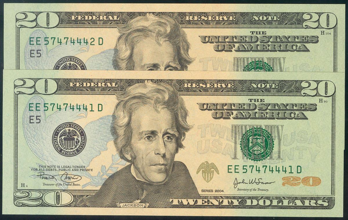 USA. 20 Dollars. Federal Reserve Note. Richmond. Correlative pair. Serial number EE-D. 2004. (Friedberg: 2089E, Pick: 521A). Uncirculated.