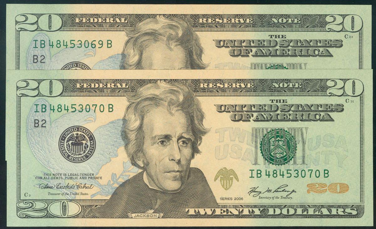 USA. 20 Dollars. Federal Reserve Note. New York. Correlative pair. Serial number IB-B. 2006. (Friedberg: 2093B, Pick: 526). Uncirculated.