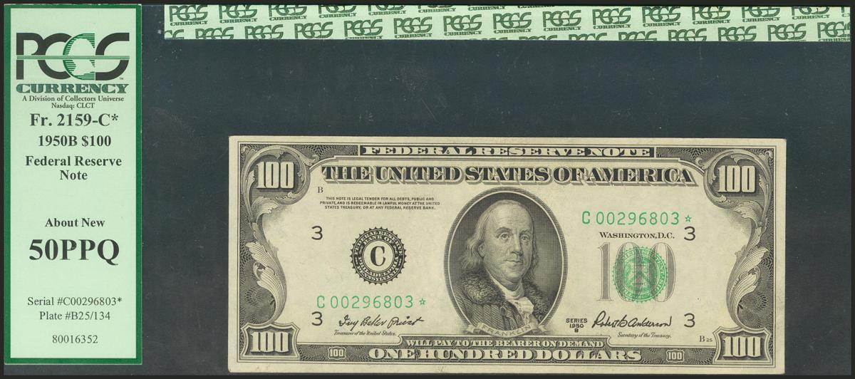 USA. 100 Dollars. Federal Reserve Note. Philadelphia. Serial number C-* star, replacement. 1950B. (Friedberg: 2159C*, Pick: 442b). PCGS50PPQ.