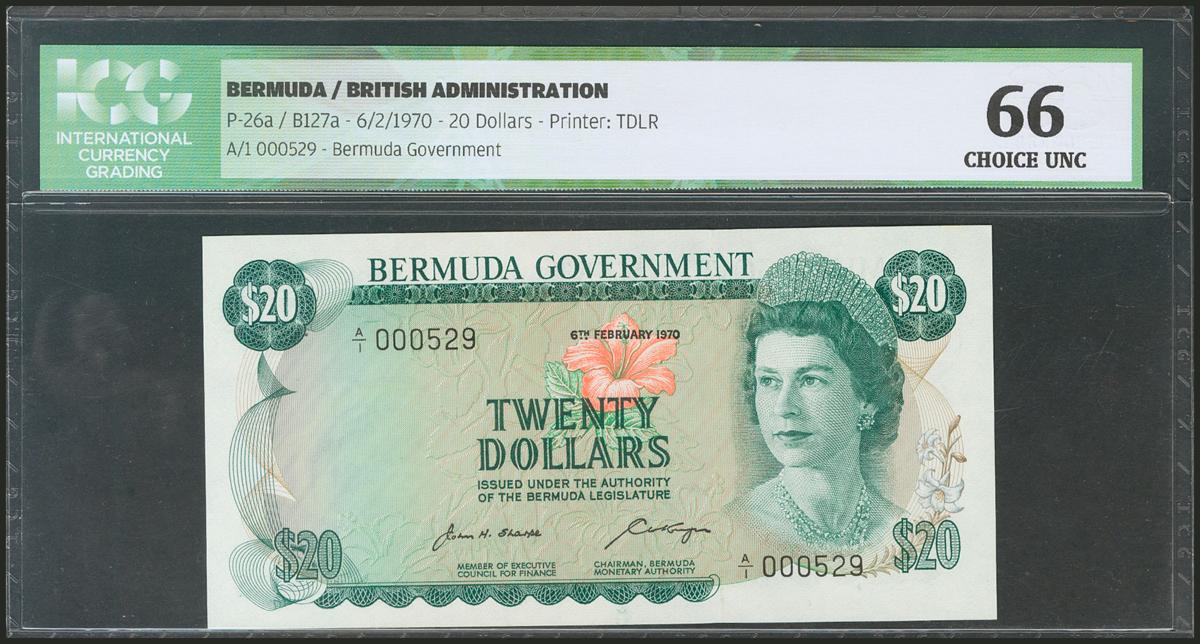 BERMUDA. 20 Dollars. 6 February 1970. Low serial. (Pick: 26a). ICG66.