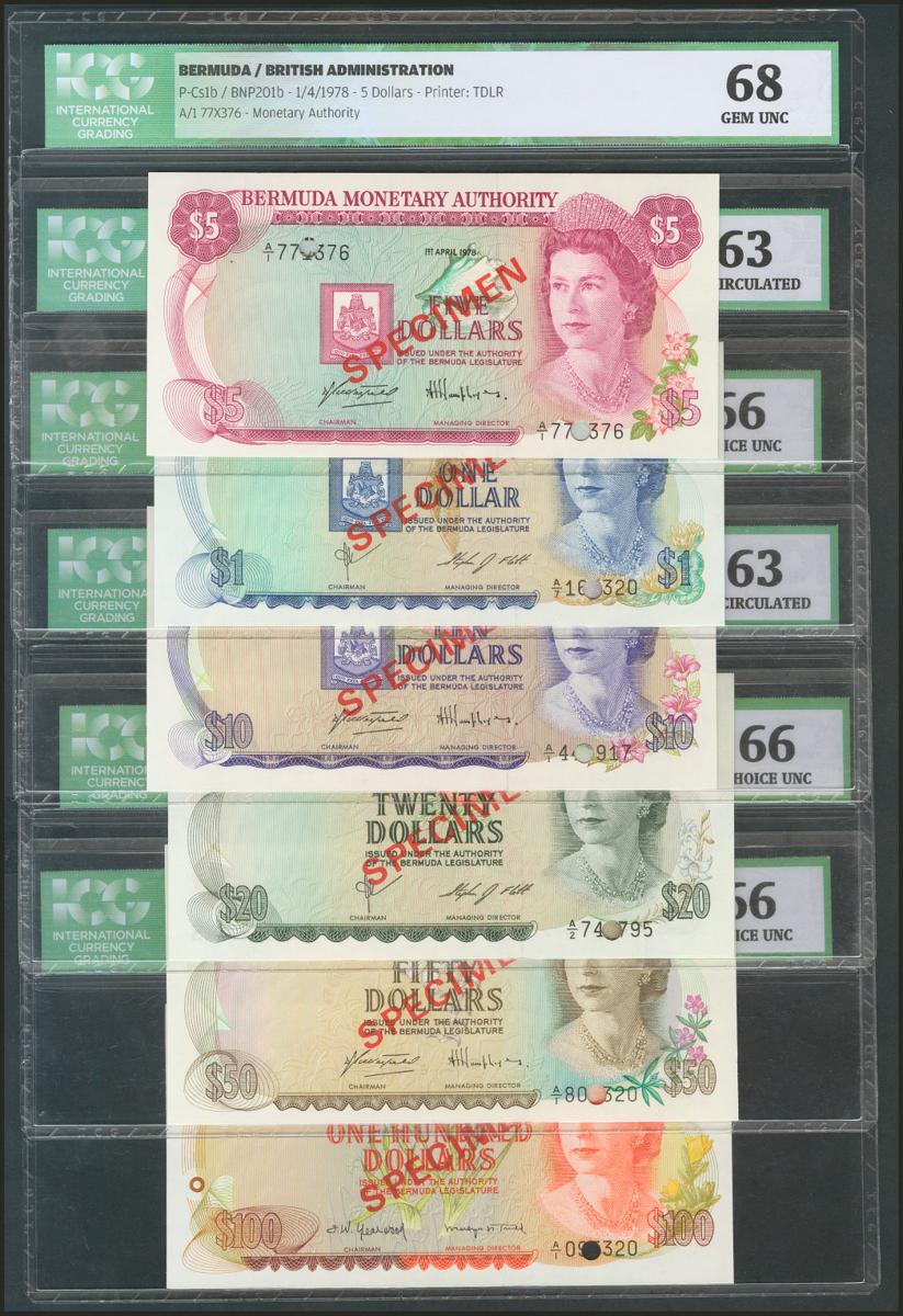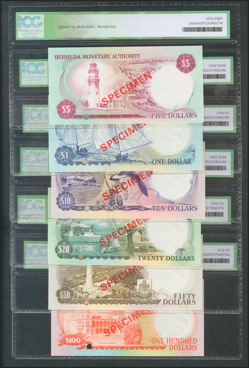 BERMUDA. 1 to 100 Dollars. (1978ca). Bermuda Monetary Authory. Specimen. (Pick: 28/33s). ICG 63, 68, 66, 63, 66, 66.
