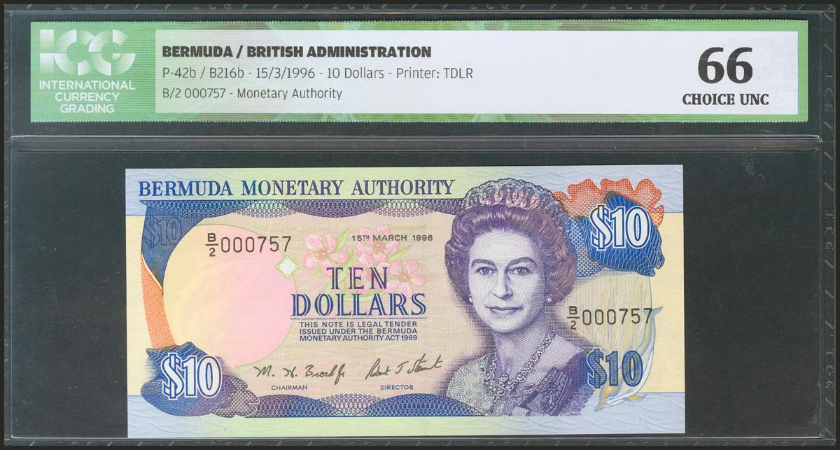 BERMUDA. 10 Dollars. 15 March 1996. Low serial. (Pick: 42b). ICG66.