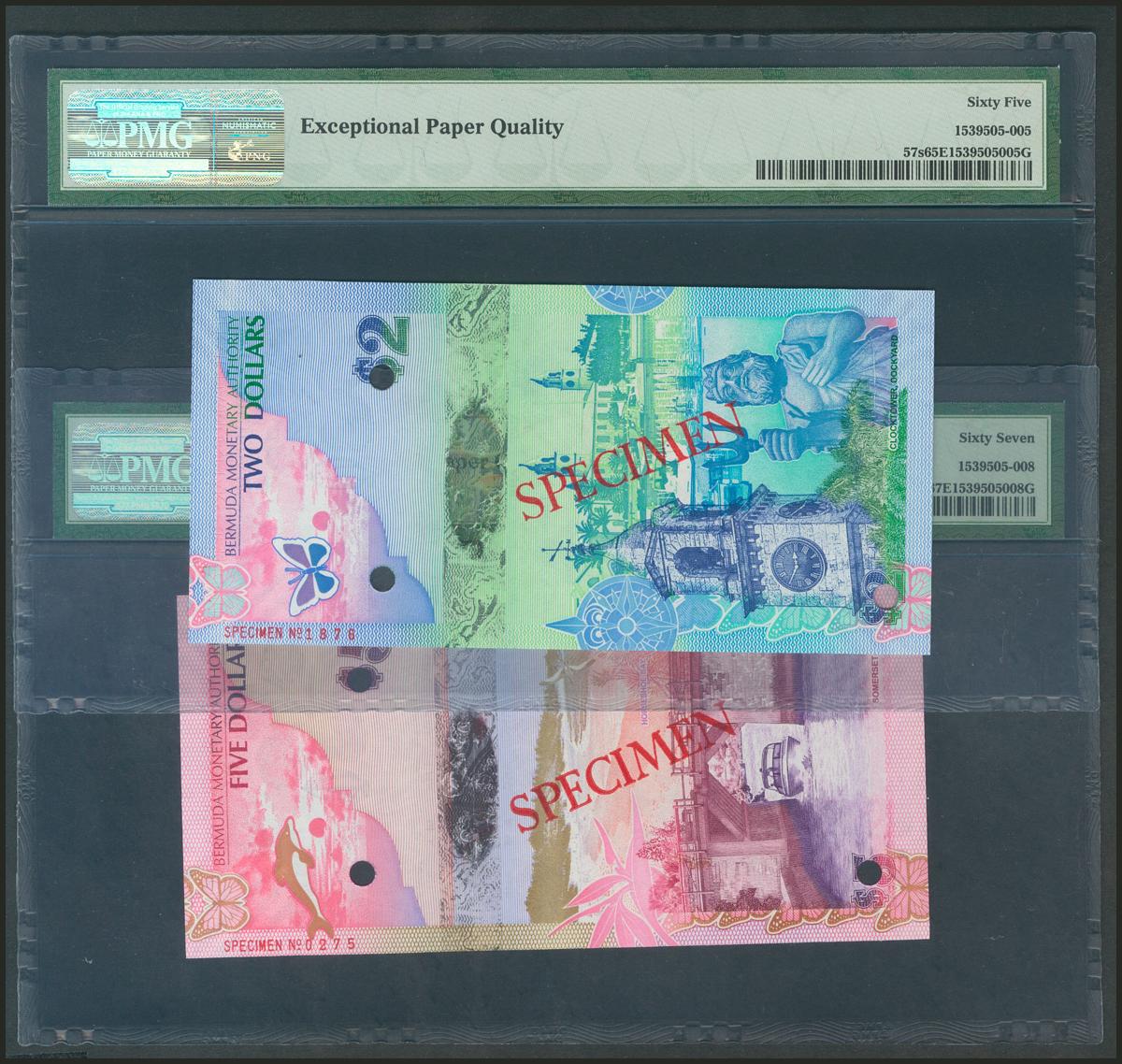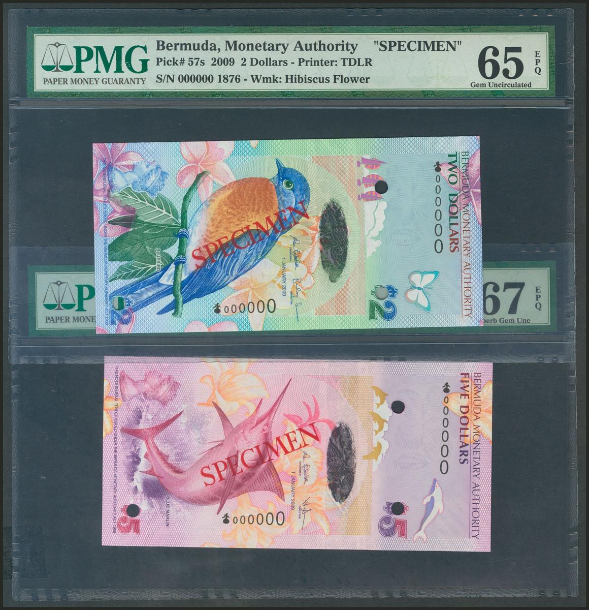 BERMUDA. Lot of 2 Dollars and 5 Dollars Specimen 2009 from Bermuda Monetary Authory (Pick: 57s, 58s). PMG 65EPQ, 67EPQ.