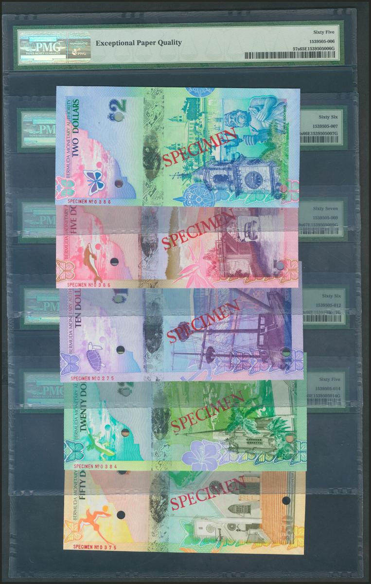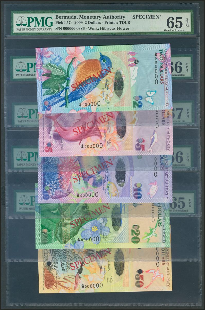 BERMUDA. Complete 2009 Specimen set from Bermuda Monetary Authory (Pick: 57s, 58s, 59s, 60s, 61s). PMG 65EPQ, 66EPQ, 67EPQ, 66EPQ, 65EPQ.