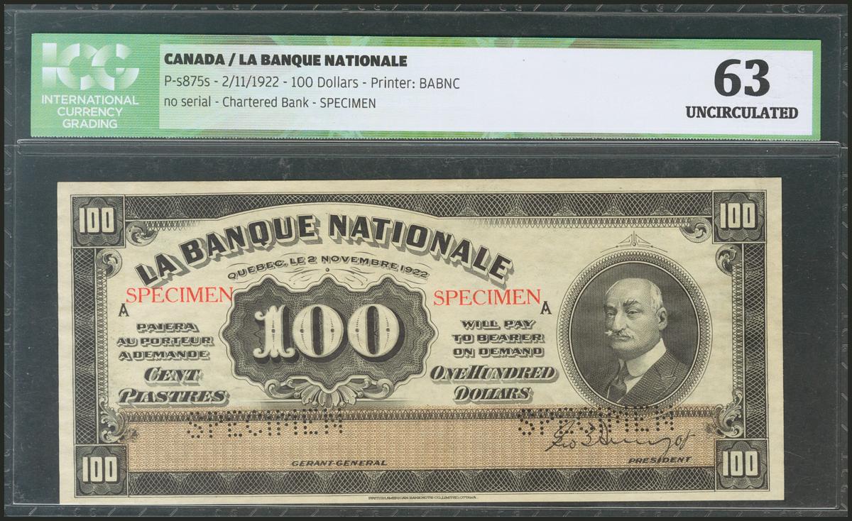 CANADA. 100 Dollars. 2 November 1922. Specimen. (Pick: s875s). ICG63.