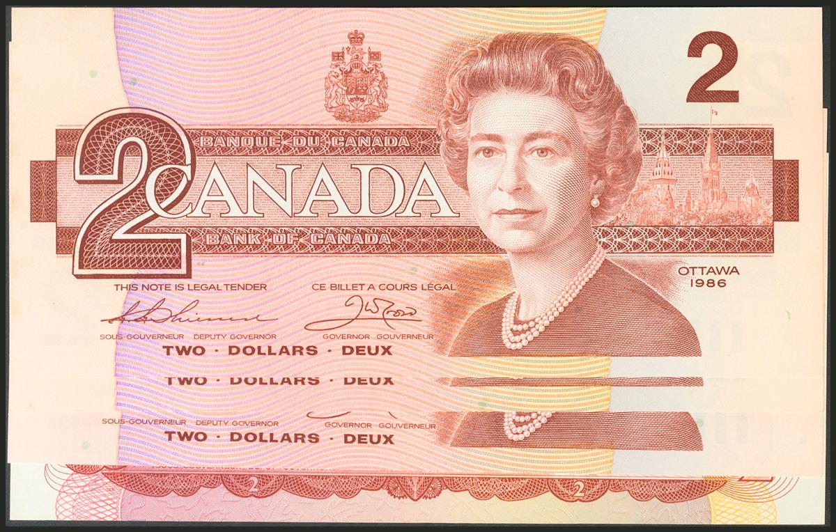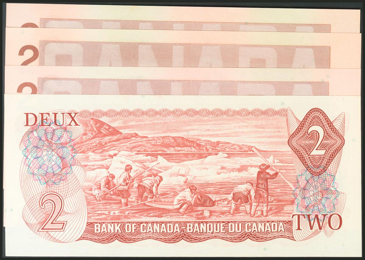 CANADA. Set of 4 banknotes of 2 Dollars, issued in 1974 and 1986. Uncirculated.