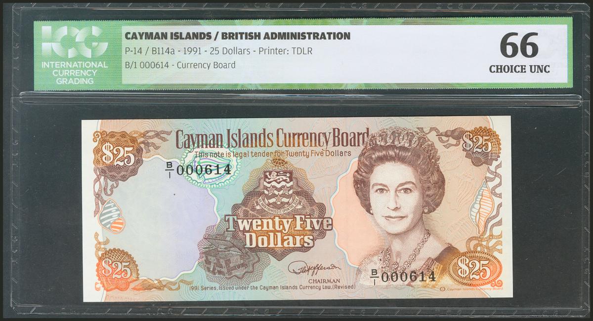 CAYMAN ISLANDS. 25 Dollars. 1991. Low serial. (Pick: 14). ICG66.