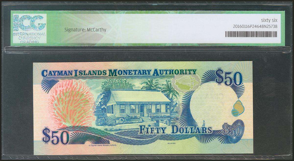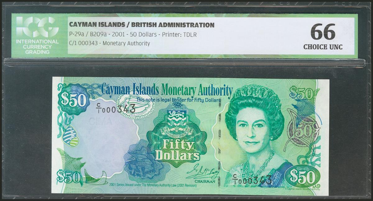 CAYMAN ISLANDS. 50 Dollars. 2001. Low serial. (Pick: 29a). ICG66.