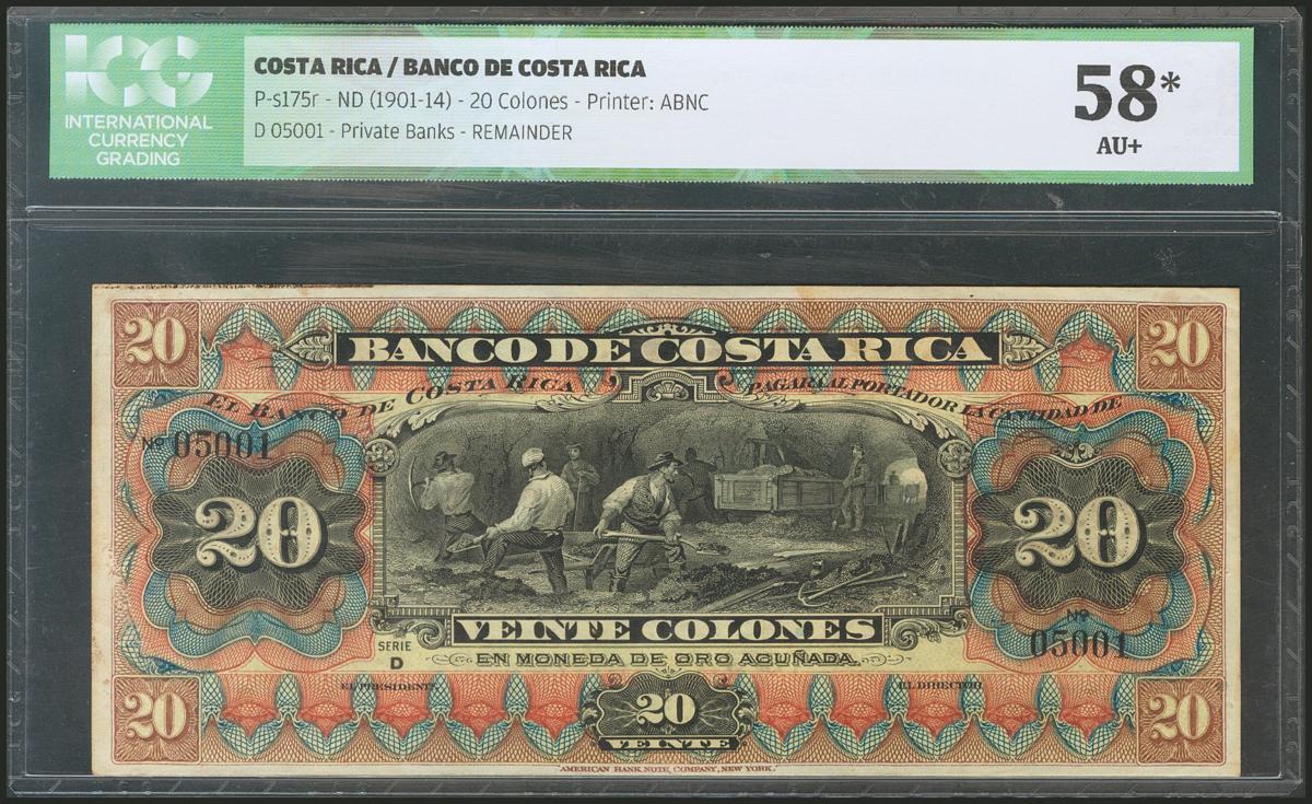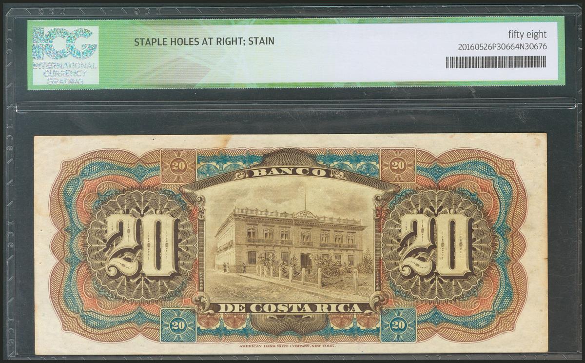 COSTA RICA. BANCO DE COSTA RICA. 20 Colones. 1901-1914. (Pick: s17r). ICG58* (staple holes at right, stain).