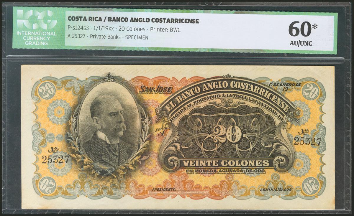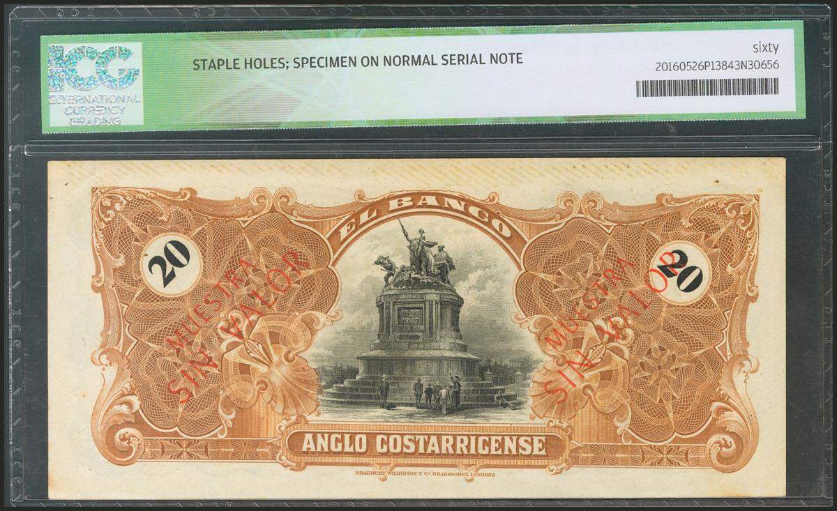 COSTA RICA. BANCO ANGLO COSTARRICENSE. 20 Colones. 1 January 19xx. Specimen on normal serial note. (Pick: s124sr). ICG60 (staple holes).