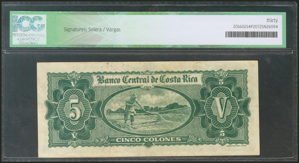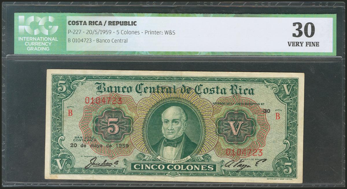 COSTA RICA. 5 Colones. 20 May 1959. (Pick: 227). ICG30.
