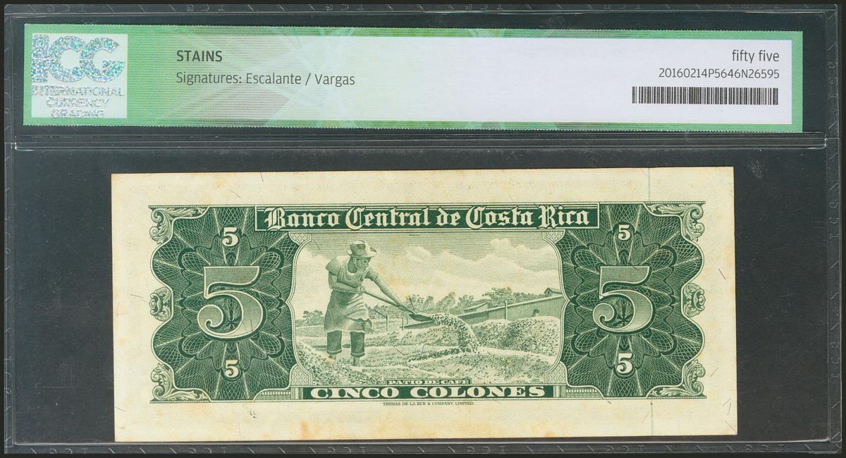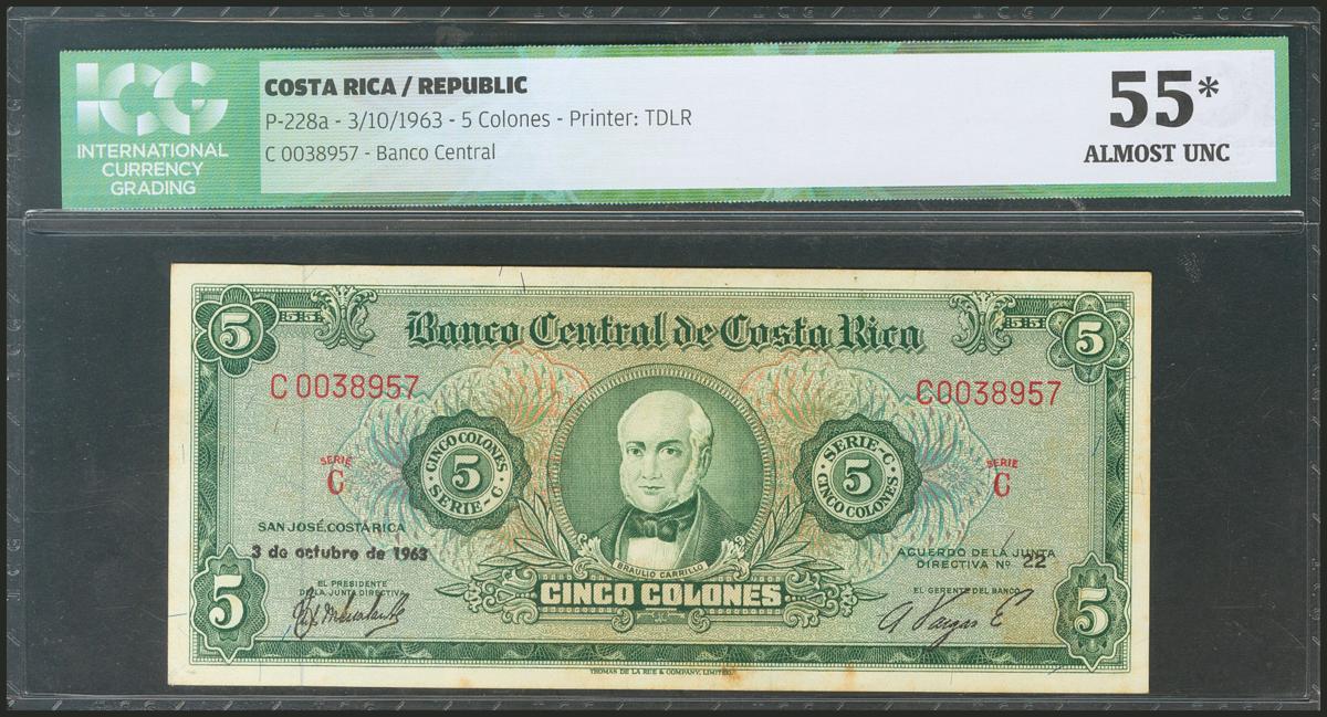 COSTA RICA. 5 Colones. 3 October 1963. (Pick: 228a). ICG55* (stains).