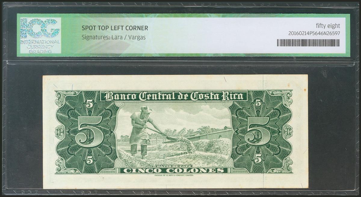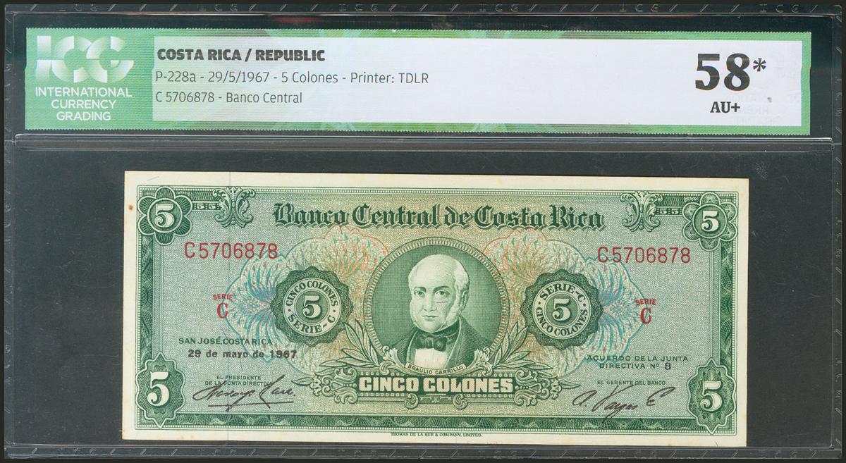COSTA RICA. 5 Colones. 29 May 1967. (Pick: 228a). ICG58* (spot top left corner).