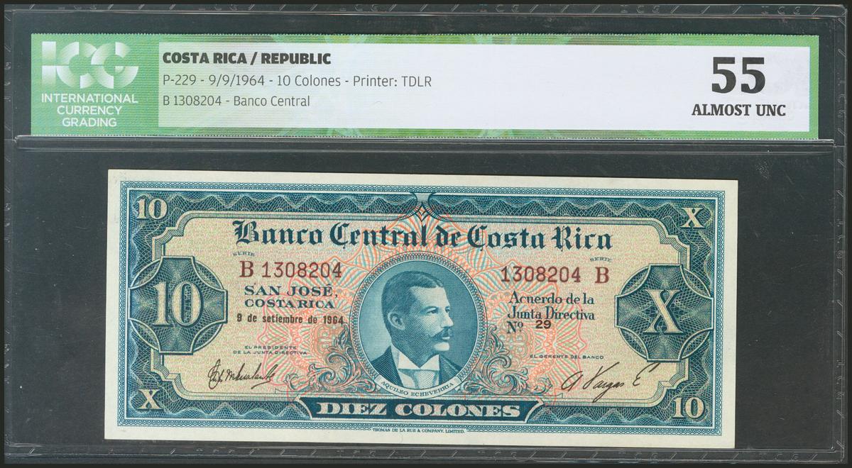 COSTA RICA. 10 Colones. 9 September 1964. (Pick: 229). ICG55.