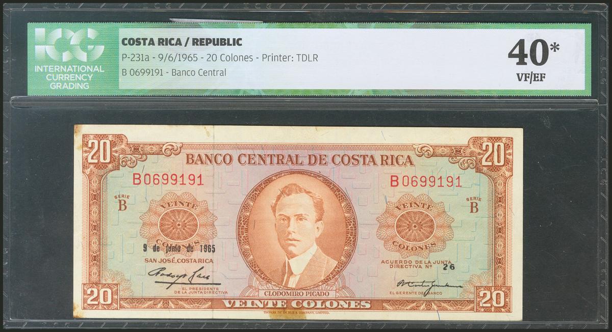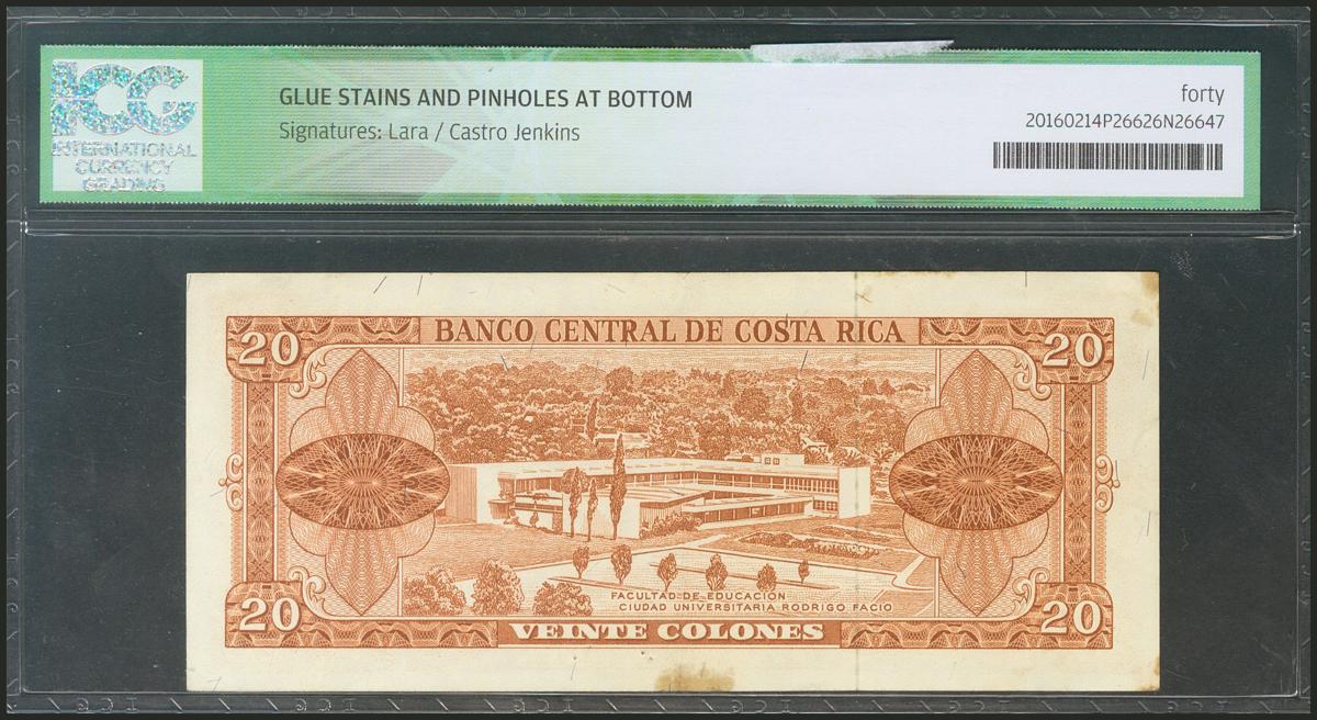 COSTA RICA. 20 Colones. 9 June 1965. (Pick: 231a). ICG40* (glue stains and pinhole at bottom).