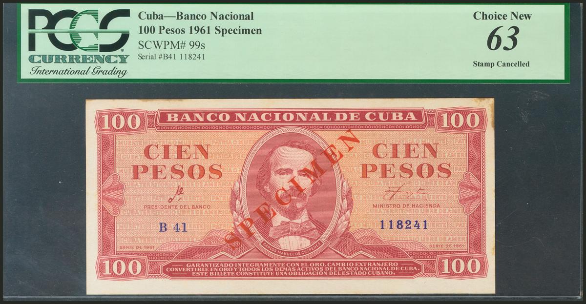 CUBA. 100 Pesos. 1961. Specimen. (Pick: 99s). PCGS63.