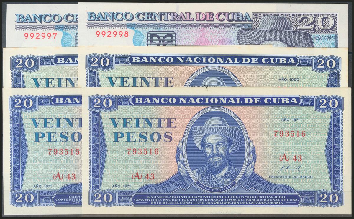 CUBA. Set of 6 banknotes of 20 Pesos. 1971/1990/2001. Three Correlative pairs, one pair with rust spots. (Pick: 105a/d, 118). Uncirculated.