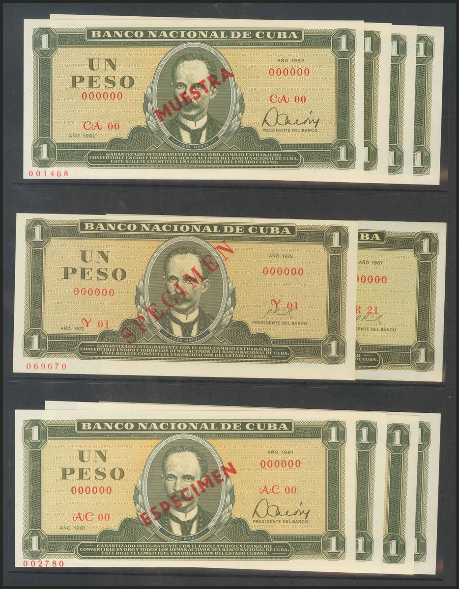 CUBA. Set of 10 banknotes of 1 Peso. 1967-1986. Specimen 000000 all them. Uncirculated.