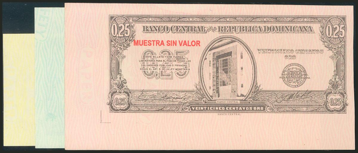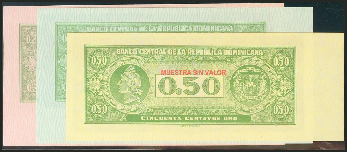 DOMINICAN REPUBLIC. Set of 3 banknotes of 10, 25 and 50 Centavos Oro. 1961. Specimen all of them. (Pick: 86s, 88s, 90s). Uncirculated.