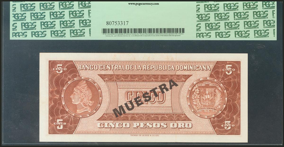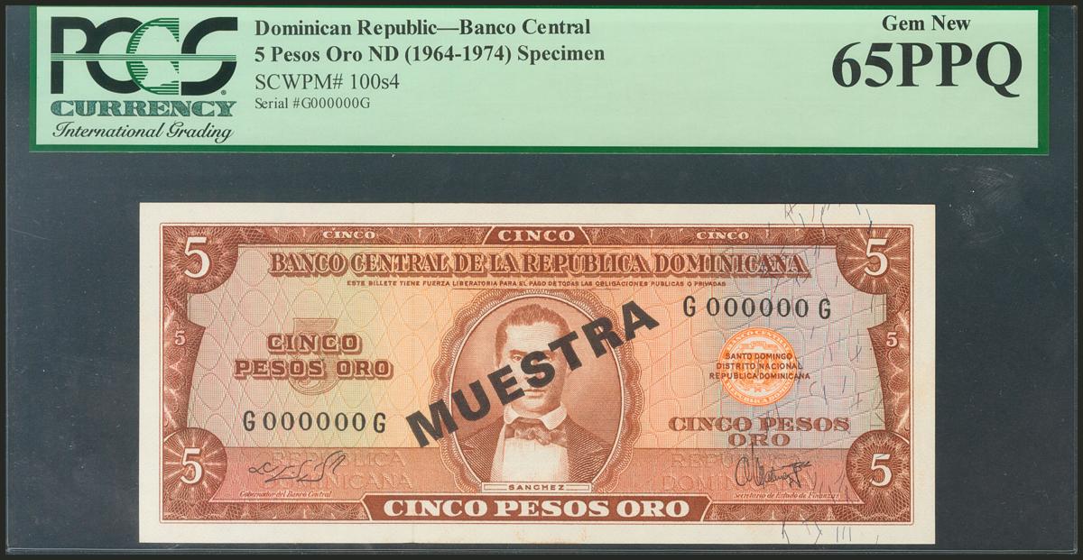 DOMINICAN REPUBLIC. 5 Pesos Oro. 1964-1974. Specimen G000000G. (Pick: 100s4). PCGS65PPQ.