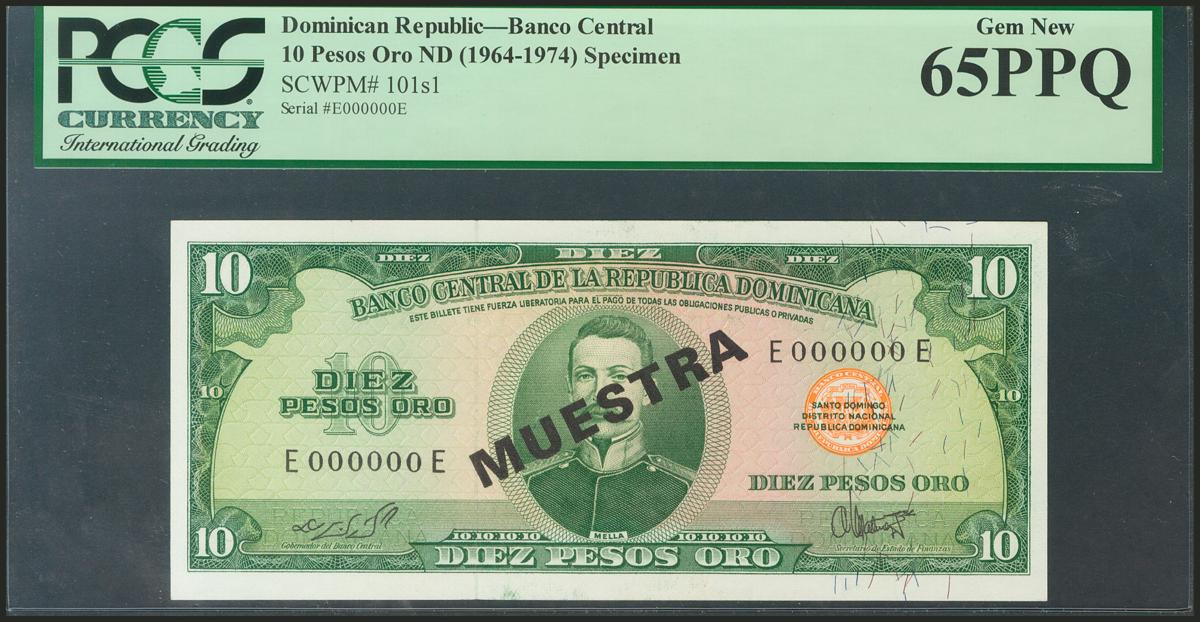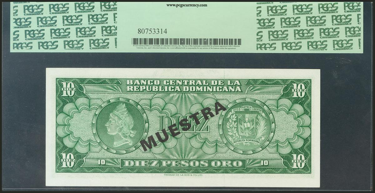 DOMINICAN REPUBLIC. 10 Pesos Oro. 1964-1974. Specimen E000000E. (Pick: 101s1). PCGS65PPQ.