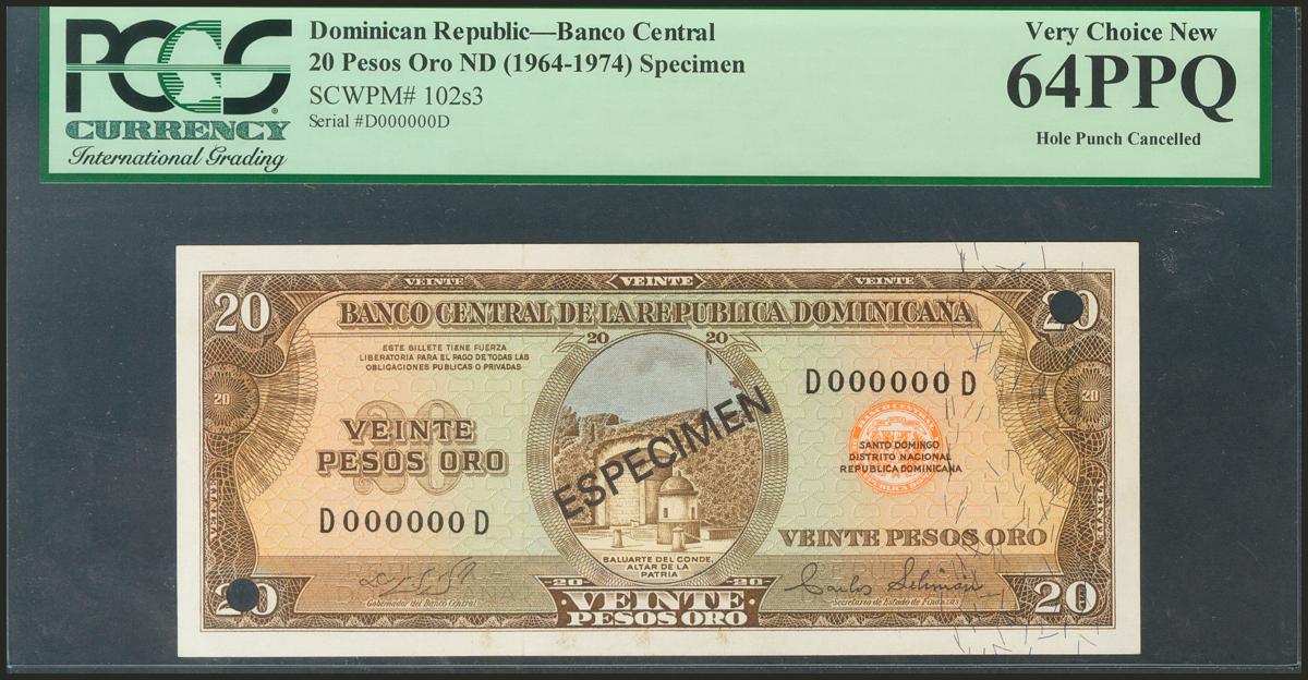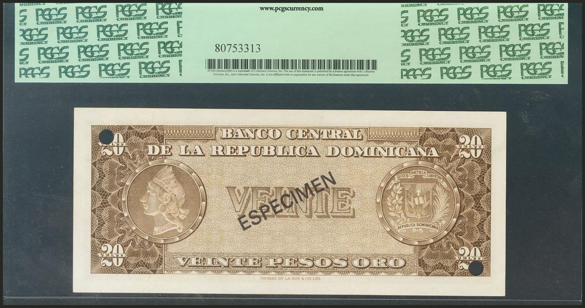 DOMINICAN REPUBLIC. 20 Pesos Oro. 1964-1974. Specimen D000000D. (Pick: 102s3). PCGS64PPQ.