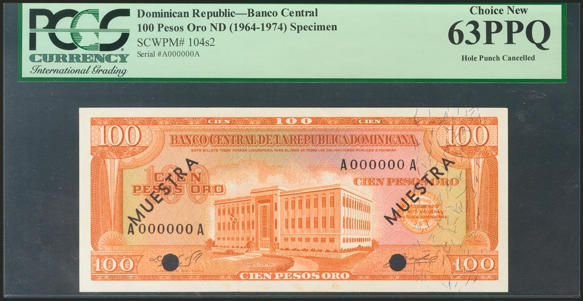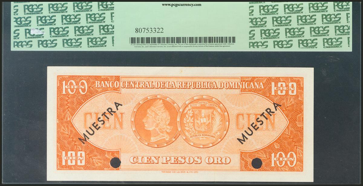 DOMINICAN REPUBLIC. 100 Pesos Oro. 1964-1974. Specimen A000000A. (Pick: 104s2). PCGS63PPQ.
