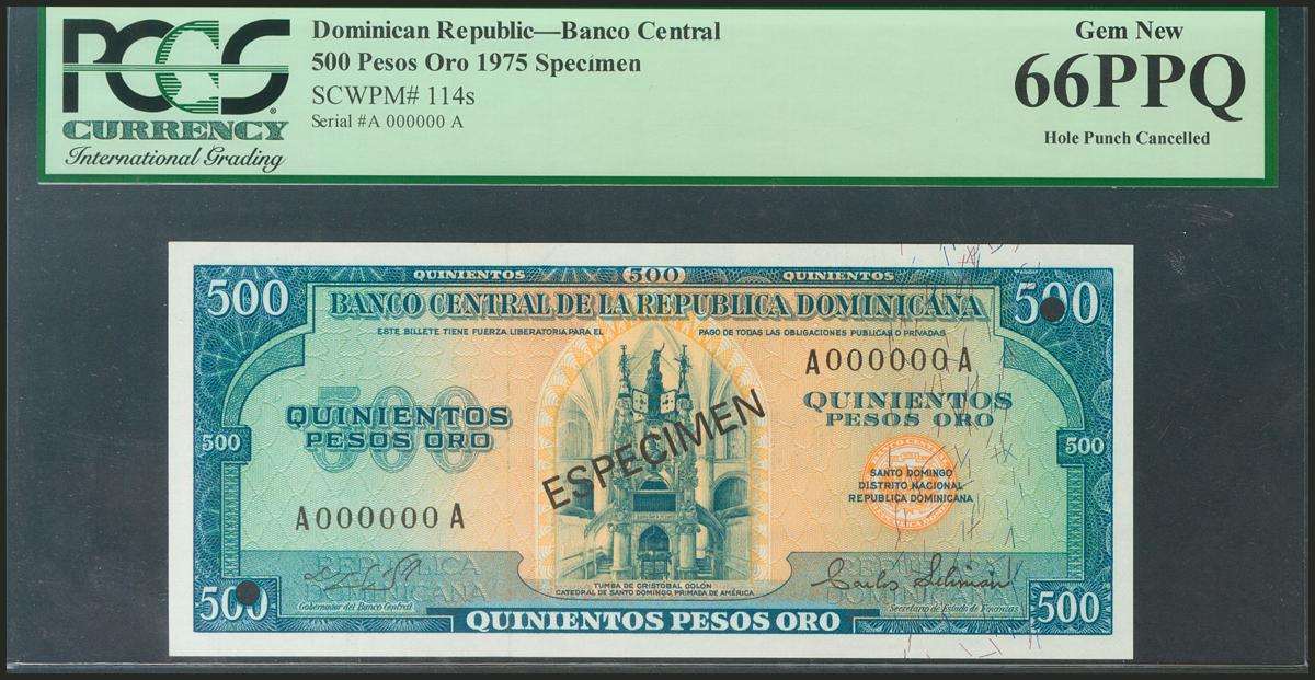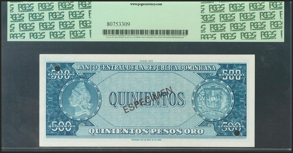 DOMINICAN REPUBLIC. 500 Pesos Oro. 1975. Specimen A000000A. (Pick: 114s). PCGS66PPQ.