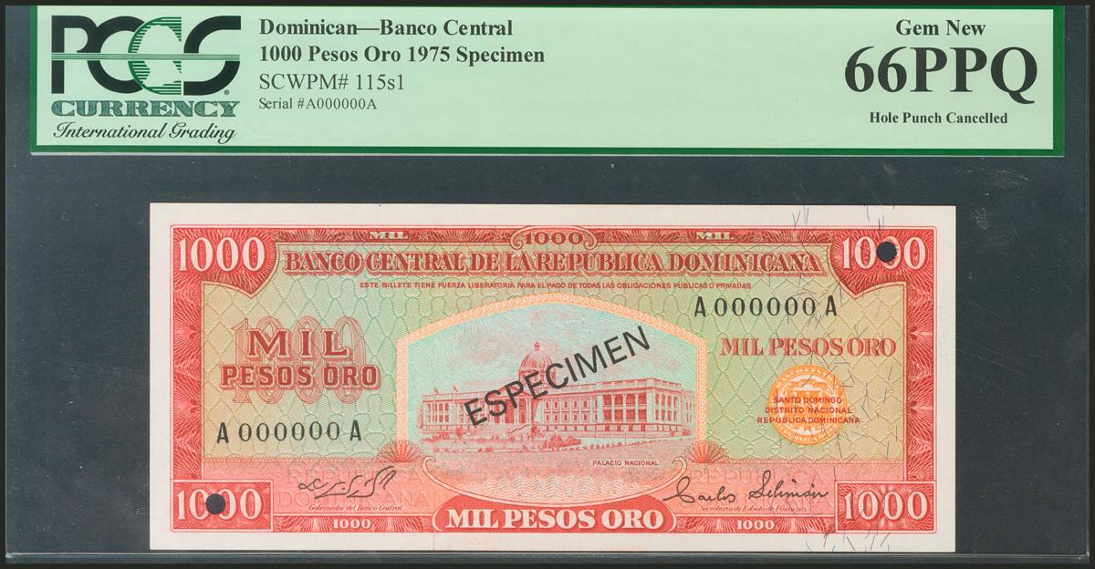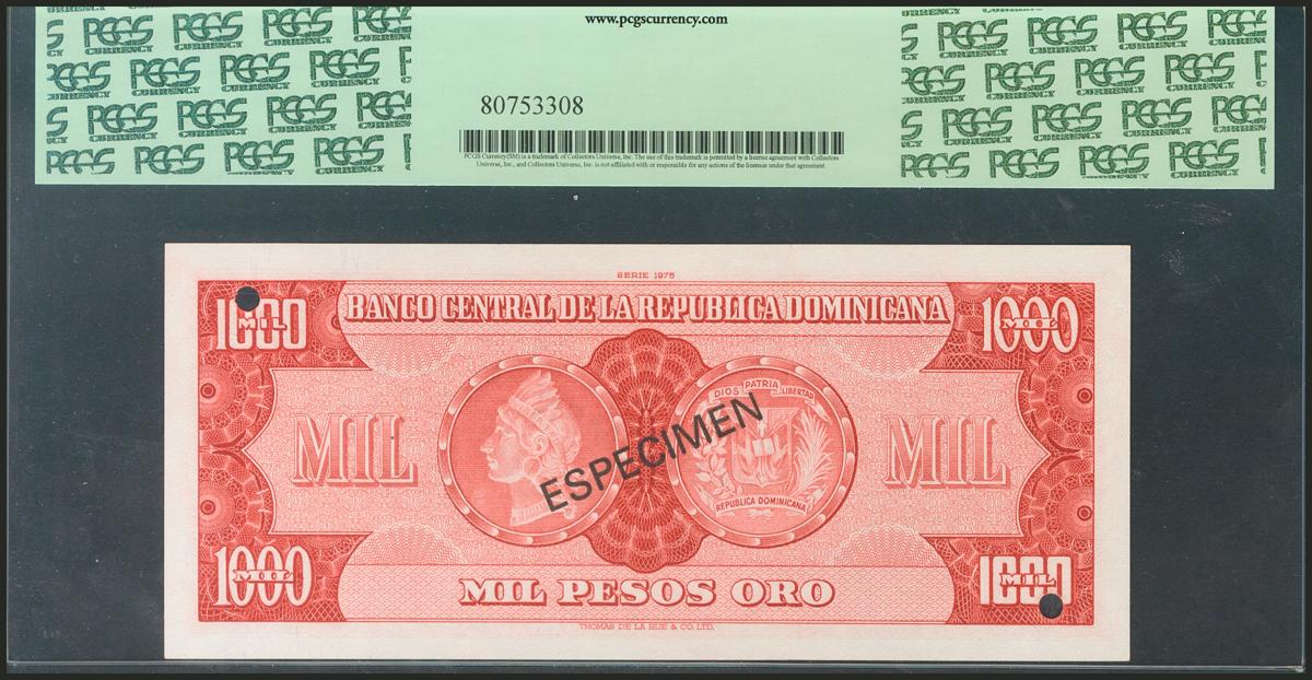 DOMINICAN REPUBLIC. 1000 Pesos Oro. 1975. Specimen A000000A. (Pick: 115s1). PCGS66PPQ.
