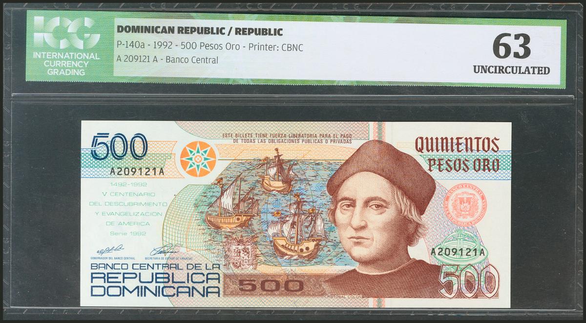 DOMINICAN REPUBLIC. 500 Pesos Oro. 1992. (Pick: 140a). ICG63.