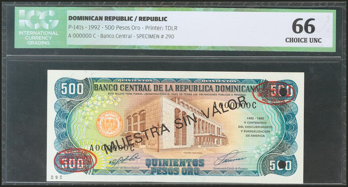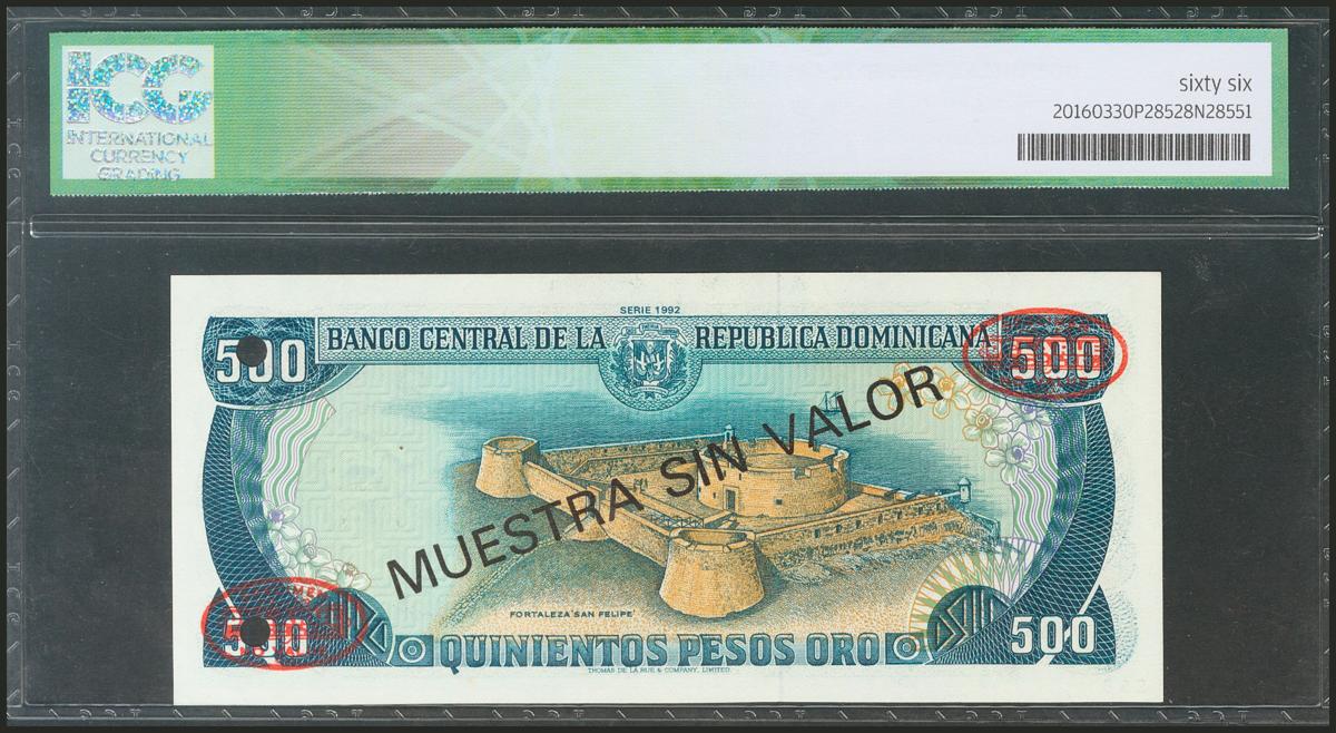 DOMINICAN REPUBLIC. 500 Pesos Oro. 1992. Specimen A000000C. (Pick: 141s). ICG66.