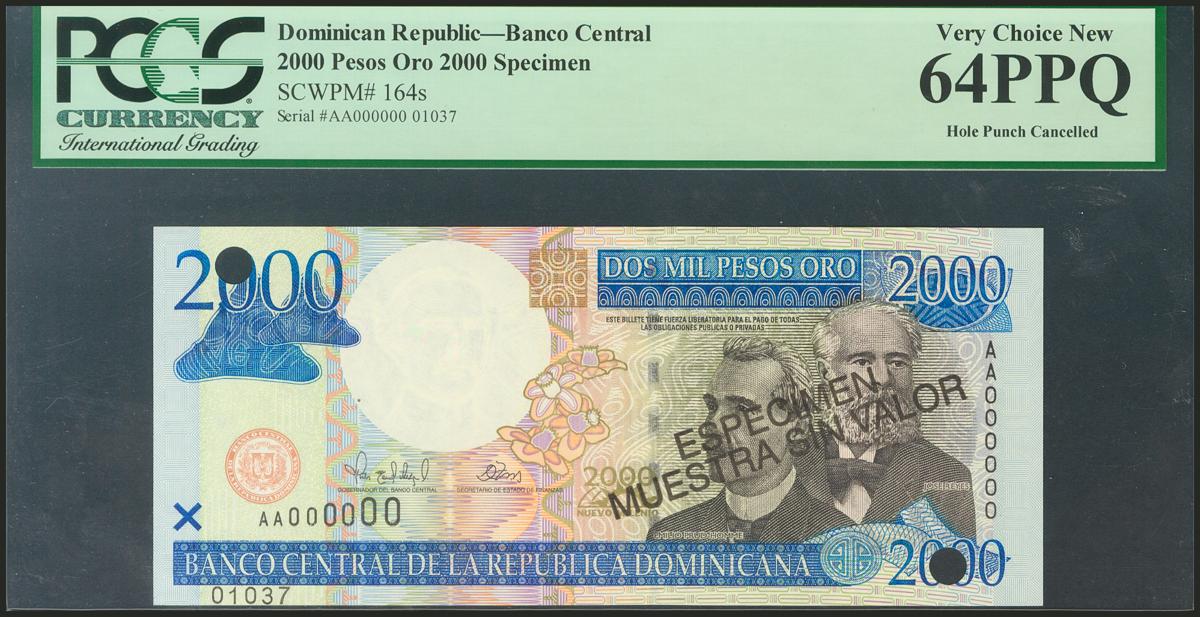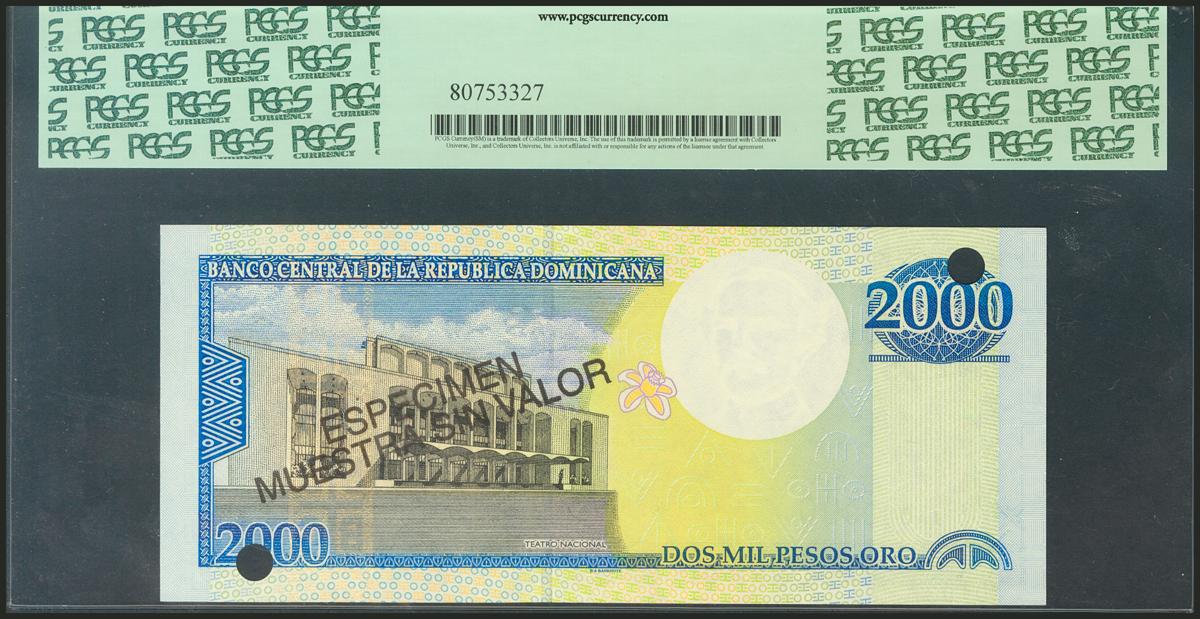 DOMINICAN REPUBLIC. 2000 Pesos Oro. 2000. Specimen AA000000. (Pick: 164s). PCGS64PPQ.