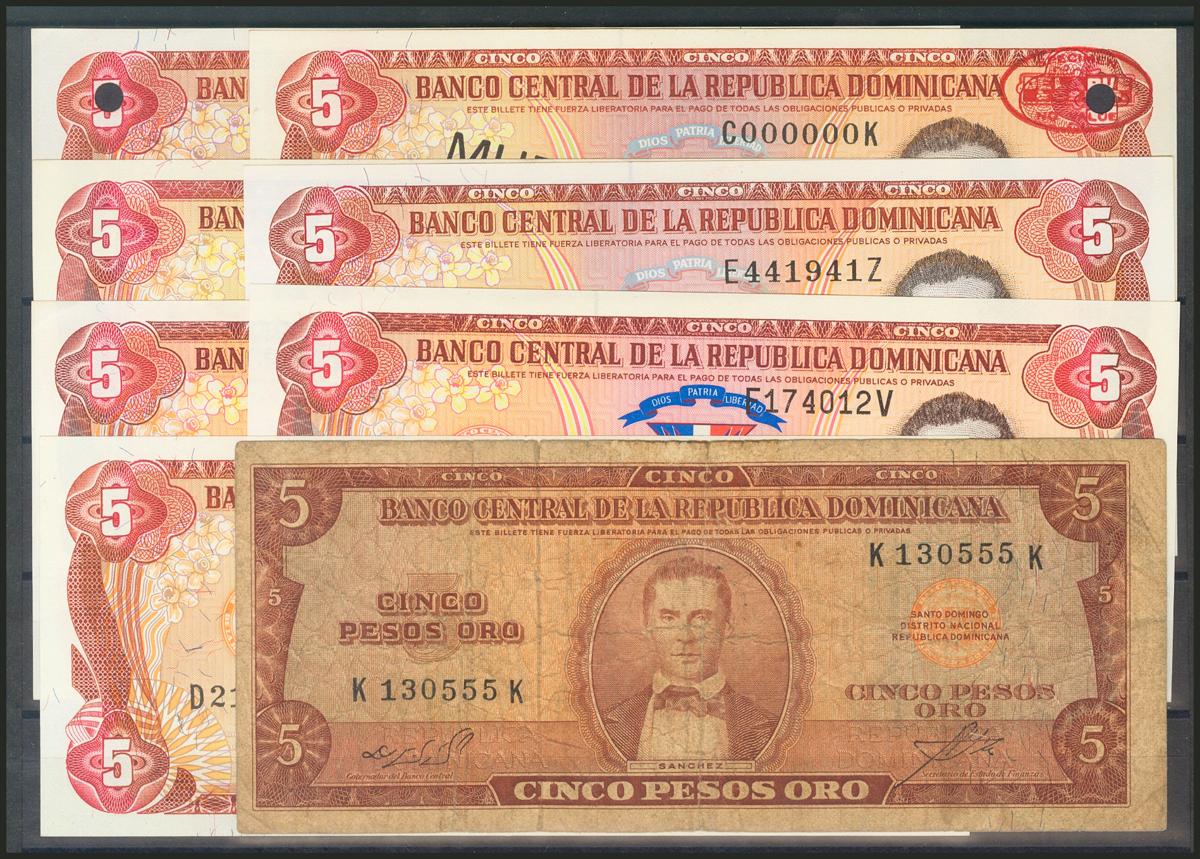 DOMINICAN REPUBLIC. Set of 8 banknotes of 5 Pesos Oro. Different dates. Included two Specimens. Good/Uncirculated.