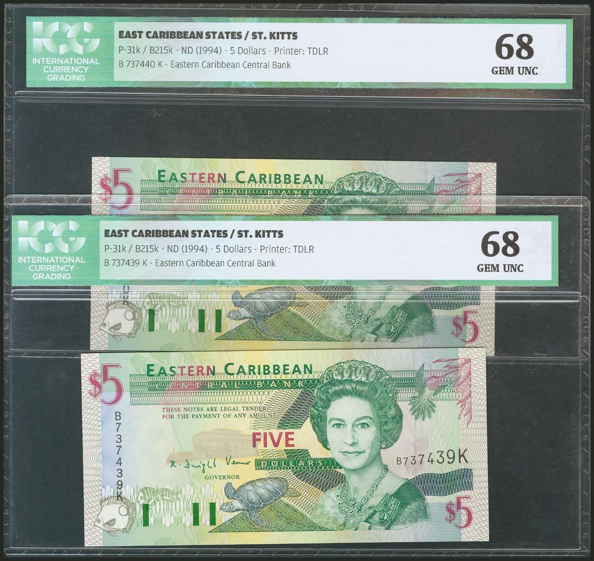 EAST CARIBBEAN STATES. 5 Dollars. 1994. Saint Kitts. Consecutive pair. (Pick: 31k). ICG68.