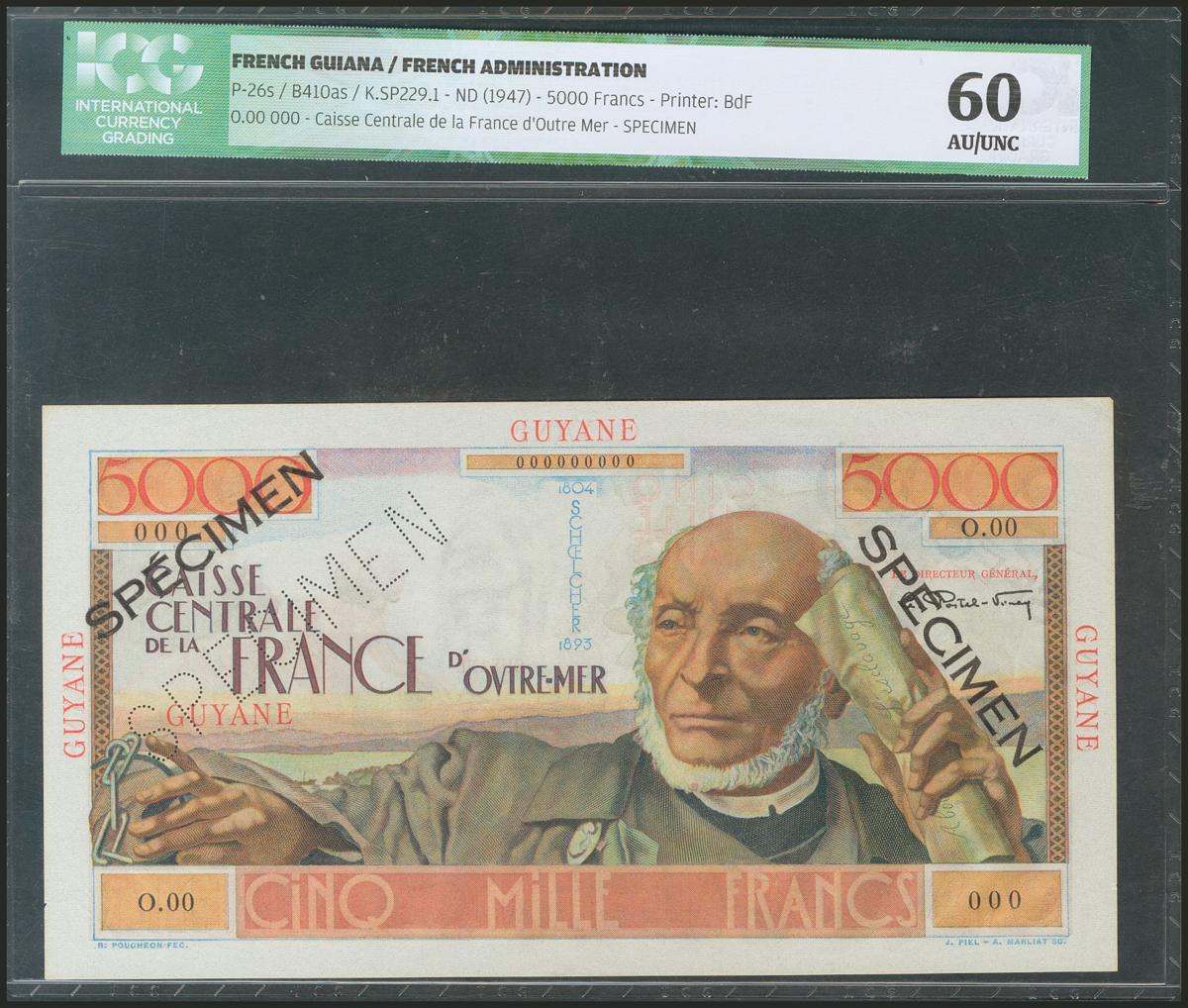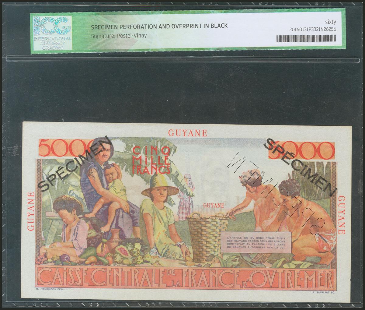 FRENCH GUIANA. 5000 Francs. 1947. Specimen. (Pick: 26s). ICG60.