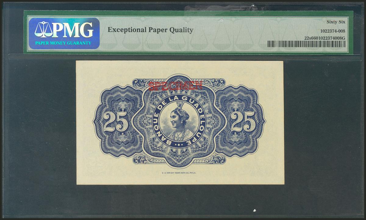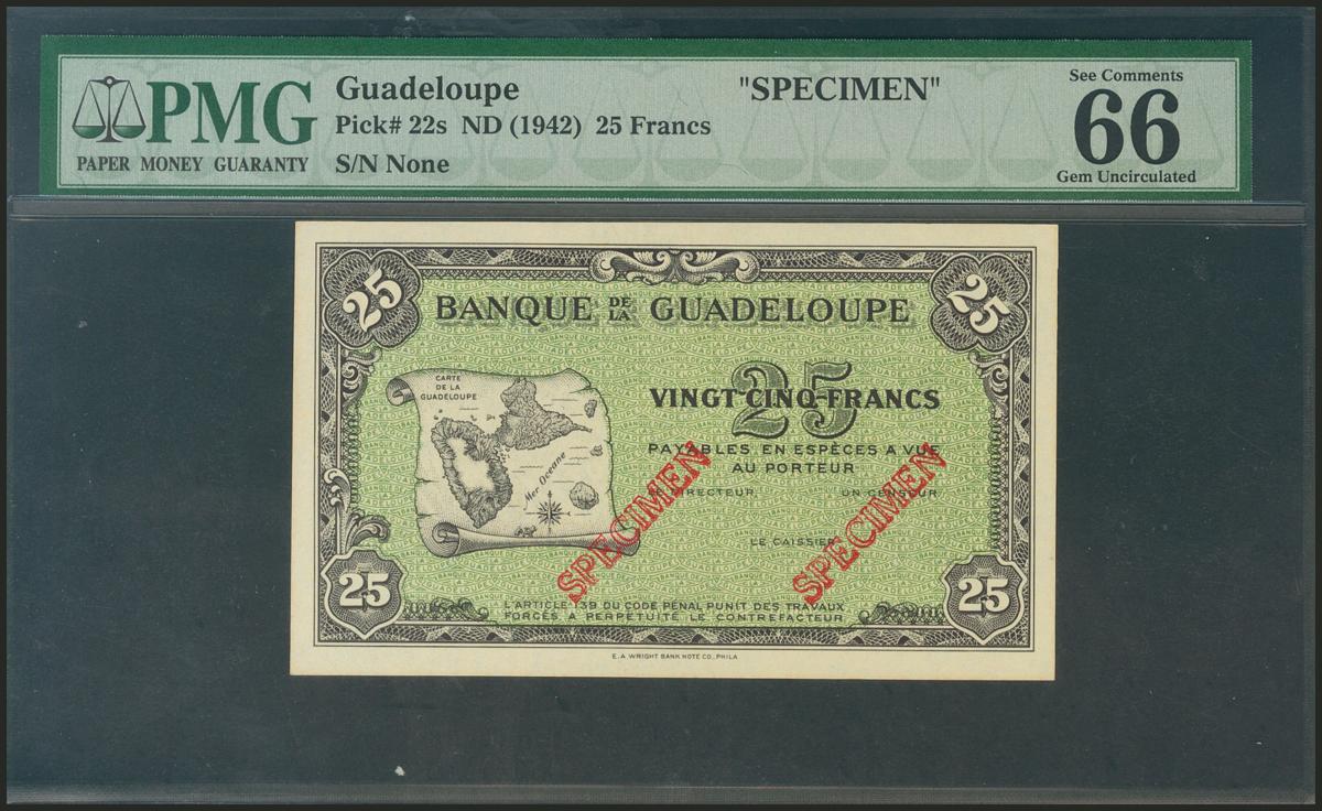 GUADELOUPE. 25 Francs. 1942. Specimen. (Pick: 22s). PMG66.