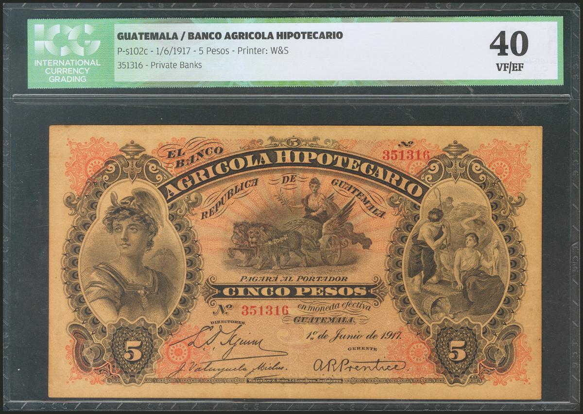 GUATEMALA. BANCO AGRICOLA HIPOTECARIO. 5 Pesos. 1 June 1917. (Pick: s102c). ICG40.