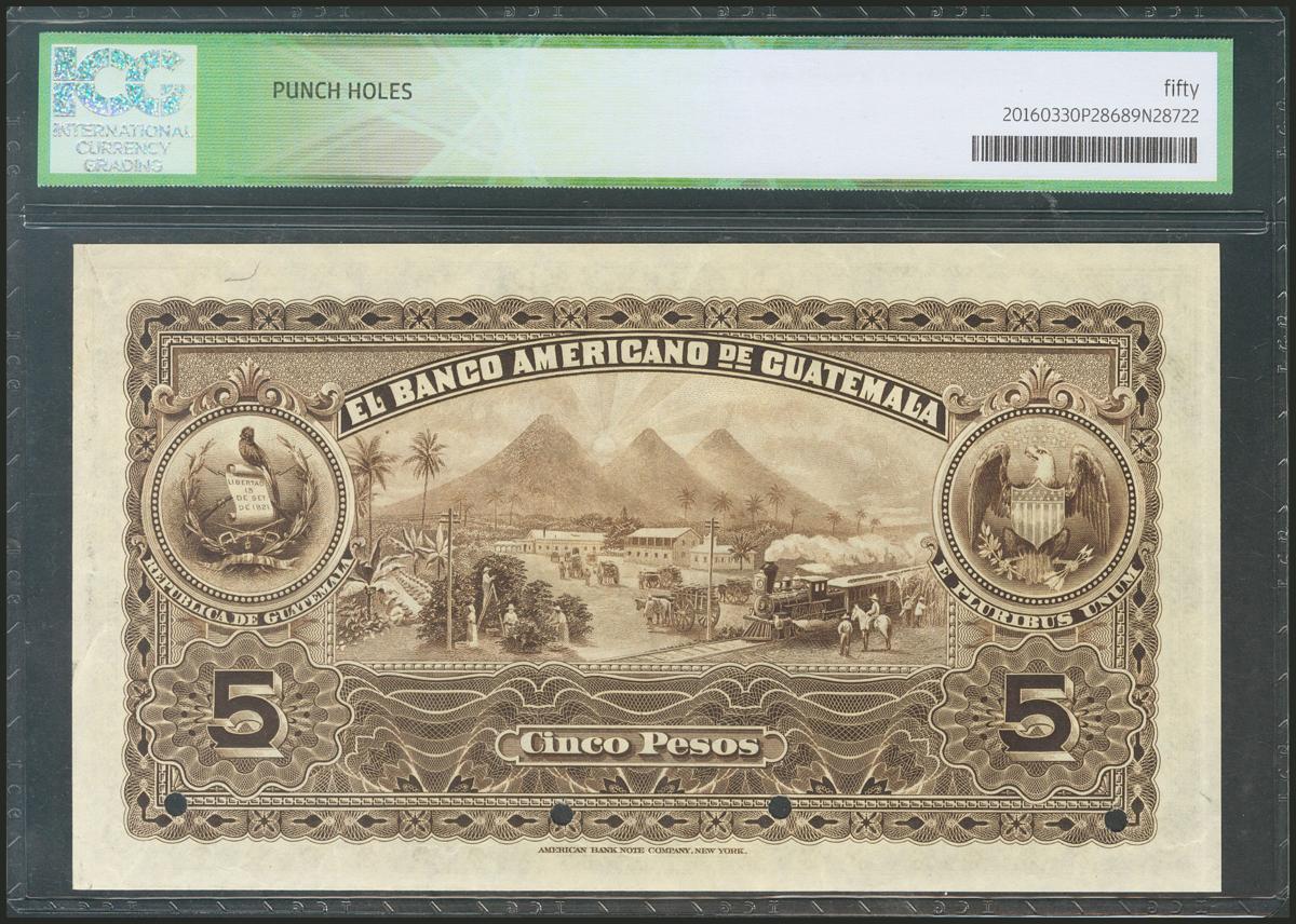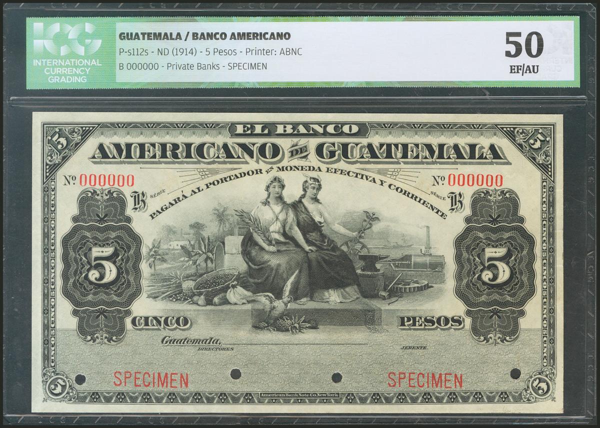 GUATEMALA. BANCO AMERICANO. 5 Pesos. 1914. Specimen B000000. (Pick: s112s). ICG50.