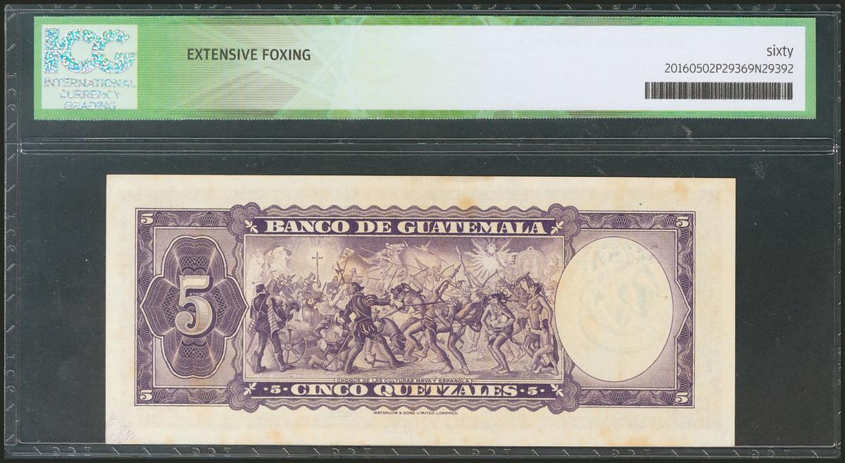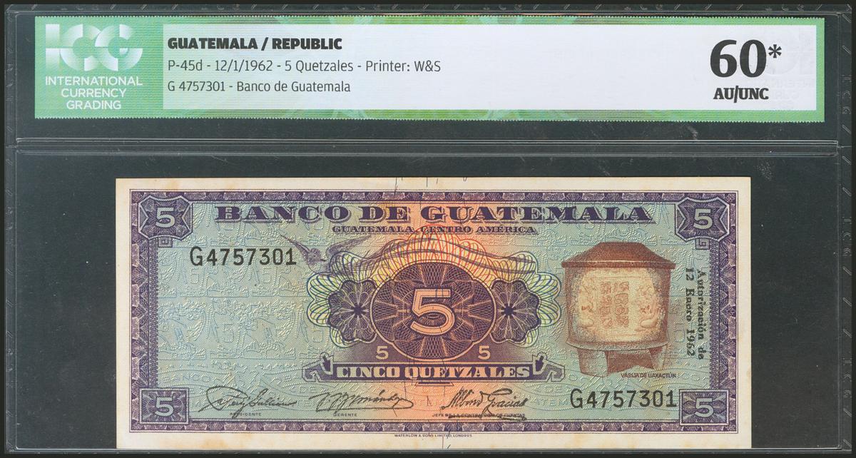 GUATEMALA. 5 Quetzales. 12 January 1962. (Pick: 45d). ICG60* (extensive foxing).