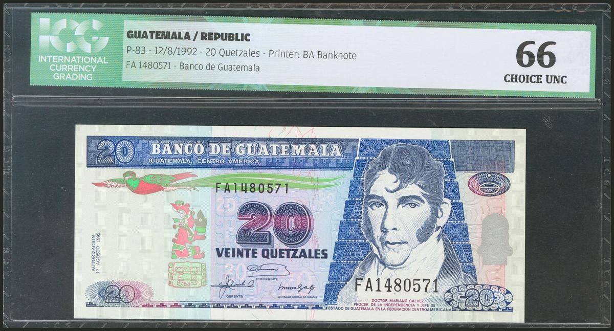 GUATEMALA. 20 Quetzales. 12 August 1992. (Pick: 83). ICG66.