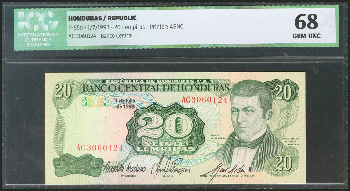 HONDURAS. 20 Lempiras. 1 July 1993. (Pick: 65d). ICG68.